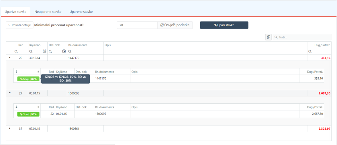 MehrParametrieren Sie die Art und Weise, wie Spalten auf der Registerkarte verglichen werden, indem Sie die Größe für jede Spalte bestimmen, die das System vergleichen soll. Der Prozentsatz der Paarung von Elementen in Finanztabellen hängt von der Parametrisierung ab.
