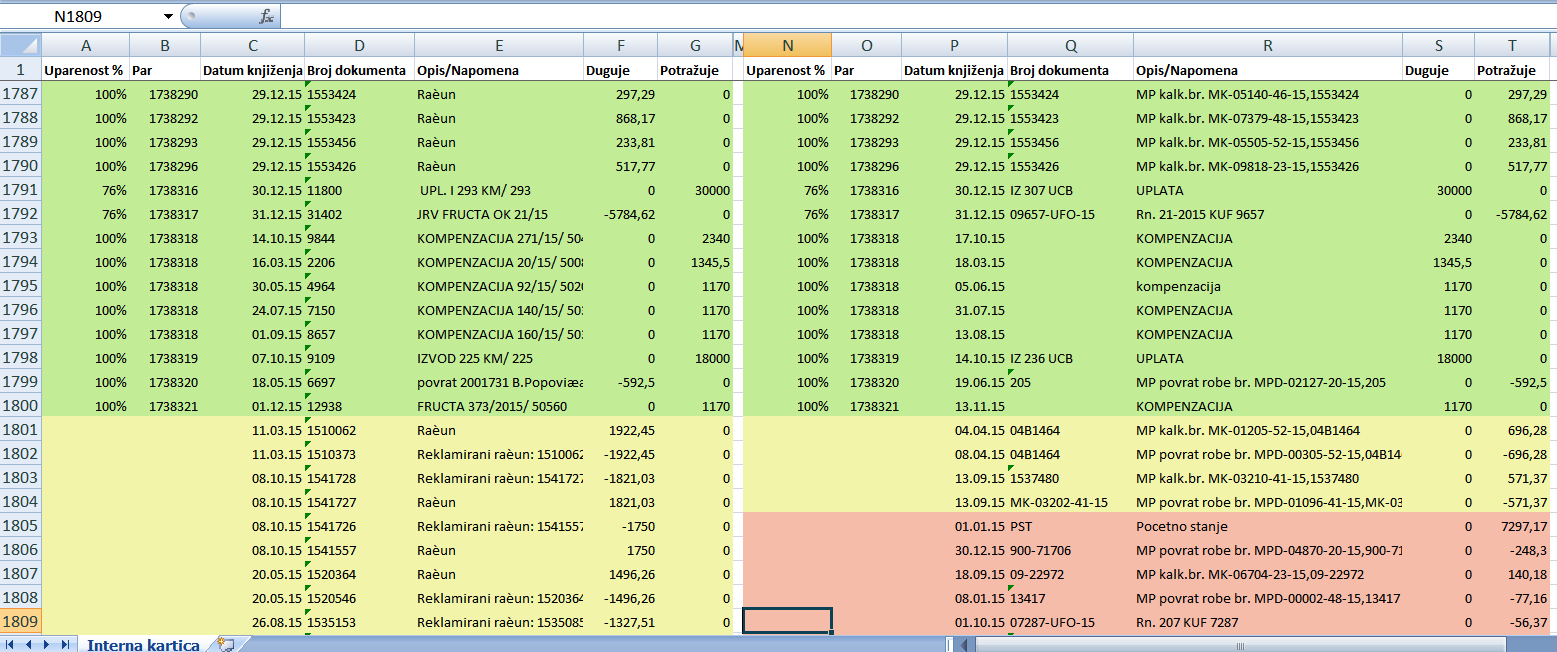 Abhängig davon, wie sicher der Artikel abgeglichen ist und je nach Artikeltyp, deaktiviert, manuell abgeglichen oder unabgeglichen, markiert das System Angaben mit unterschiedlichen Grün-, Orange- und Rottönen, sodass der Bericht unabhängig von der Anzahl der Angaben einfach angezeigt werden kann.